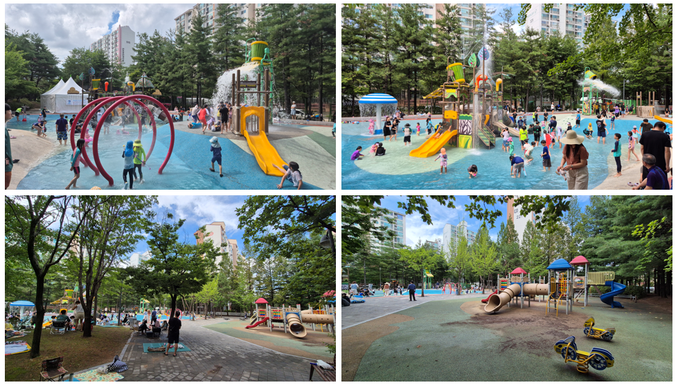산들어린이공원은 수원시 권선구 권선동, 아파트 단지 사이에 자리 잡고 있으며 울창한 소나무로 둘러싸여 있어 도심 속에서도 시원한 그늘을 제공합니다. 물놀이뿐 아니라, 그늘 아래에서 쉴 수 있고 매미 소리를 들으며 여름의 정취를 느낄 수 있는 힐링 공간입니다.