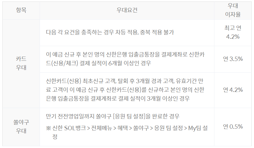 카드 결제 실적 등 우대조건은 신규 가입 월부터 만기월의 전전월 말일까지의 실적을 기준으로 산정됩니다. 단, 중도 해지 시 우대이율 미적용되며, 기본금리만 제공됩니다.