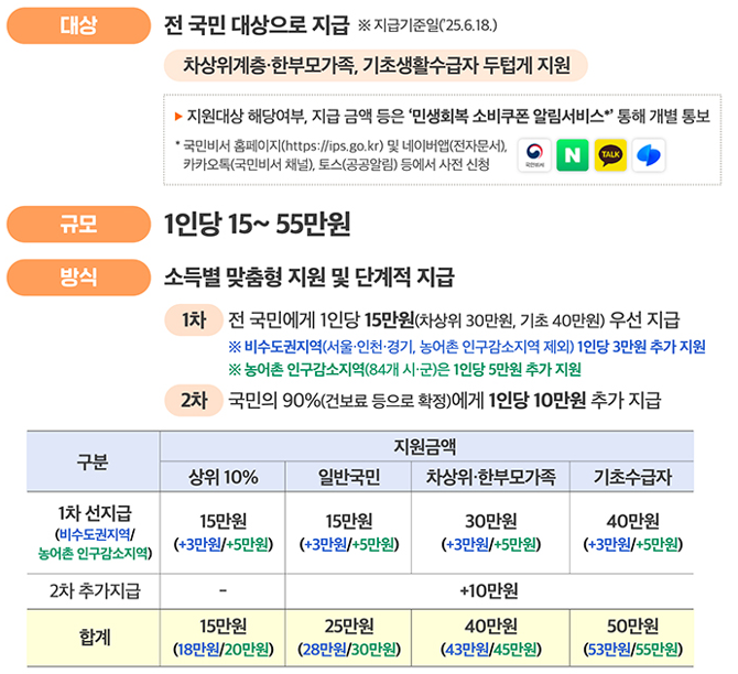 - 지급 대상: 2025년 6월 18일 기준 국내 거주 중인 전 국민
