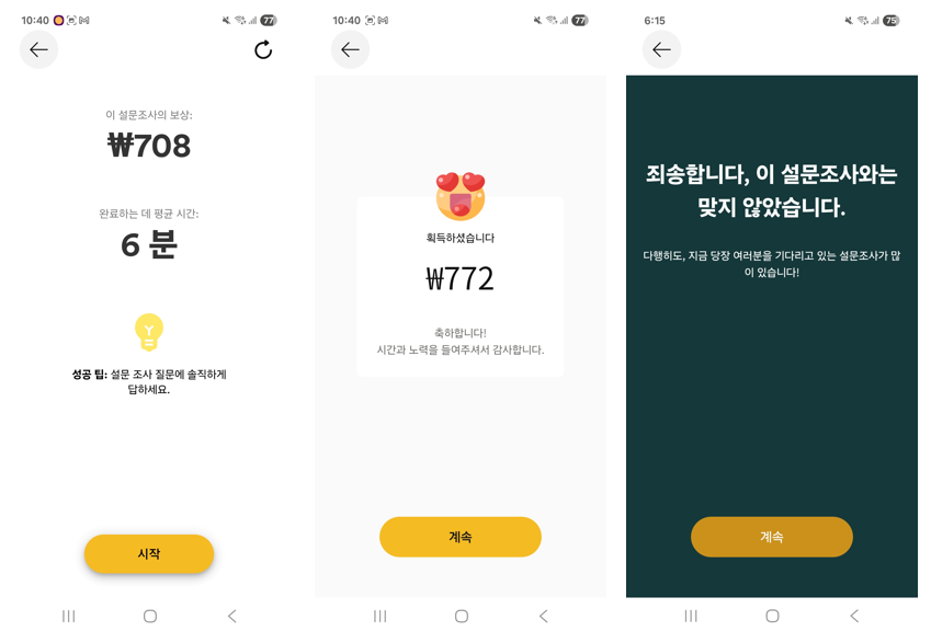 그러나 속도, 설문 자격 조건, 설문 추천 방식 등 여러 불편 요소도 존재하므로, 이러한 점들을 감안하고 사용하는 것이 좋습니다. 소소하게 용돈을 벌고 싶은 분이라면 한 번쯤 체험해볼 만한 앱이라고 생각합니다.